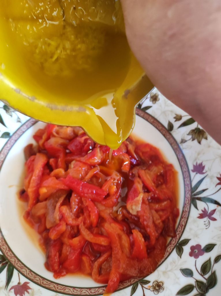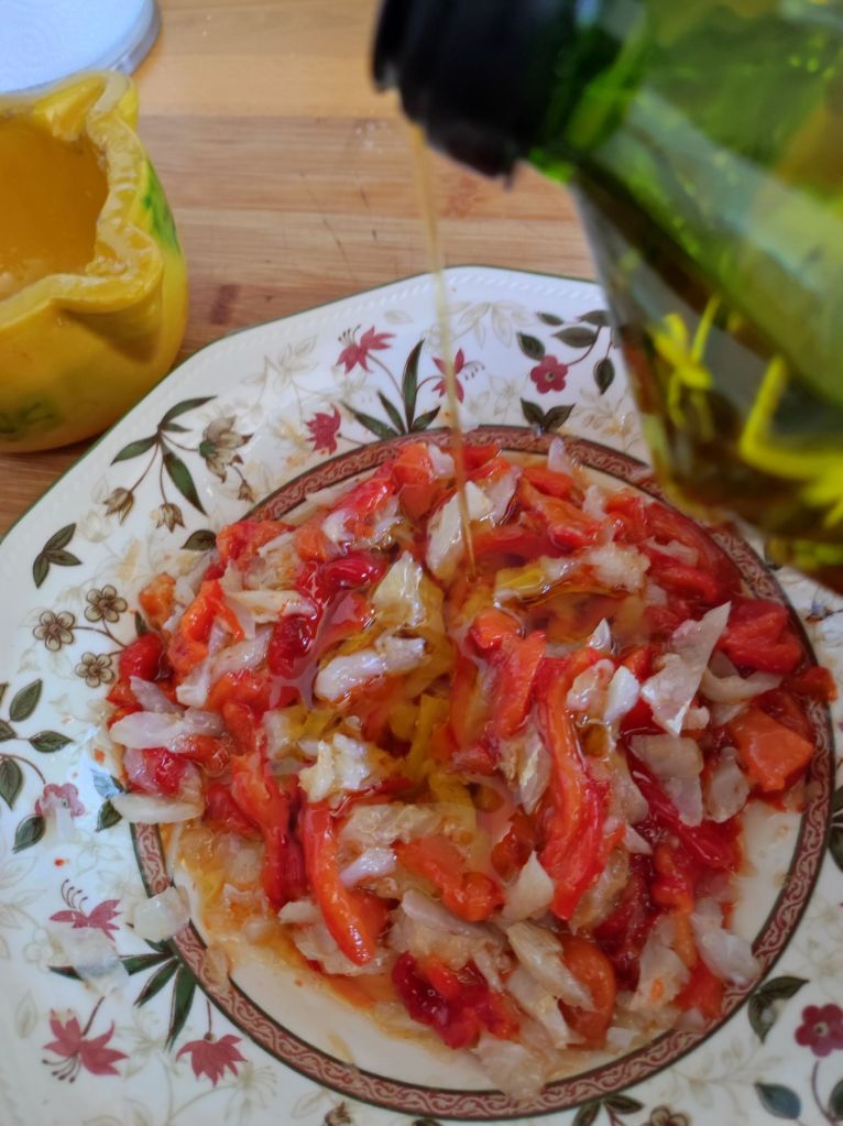 - Añade el bacalao al pimiento , mezcla y riega con aceite de oliva, el suficiente para que el bacalao se imprecne bien de el.