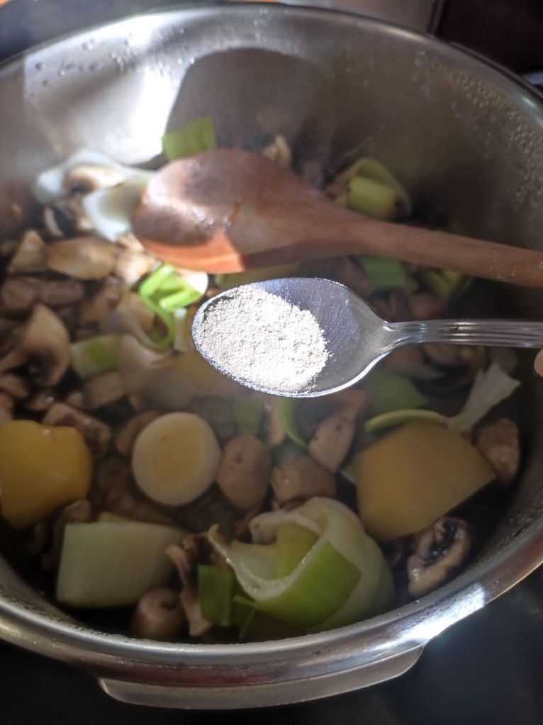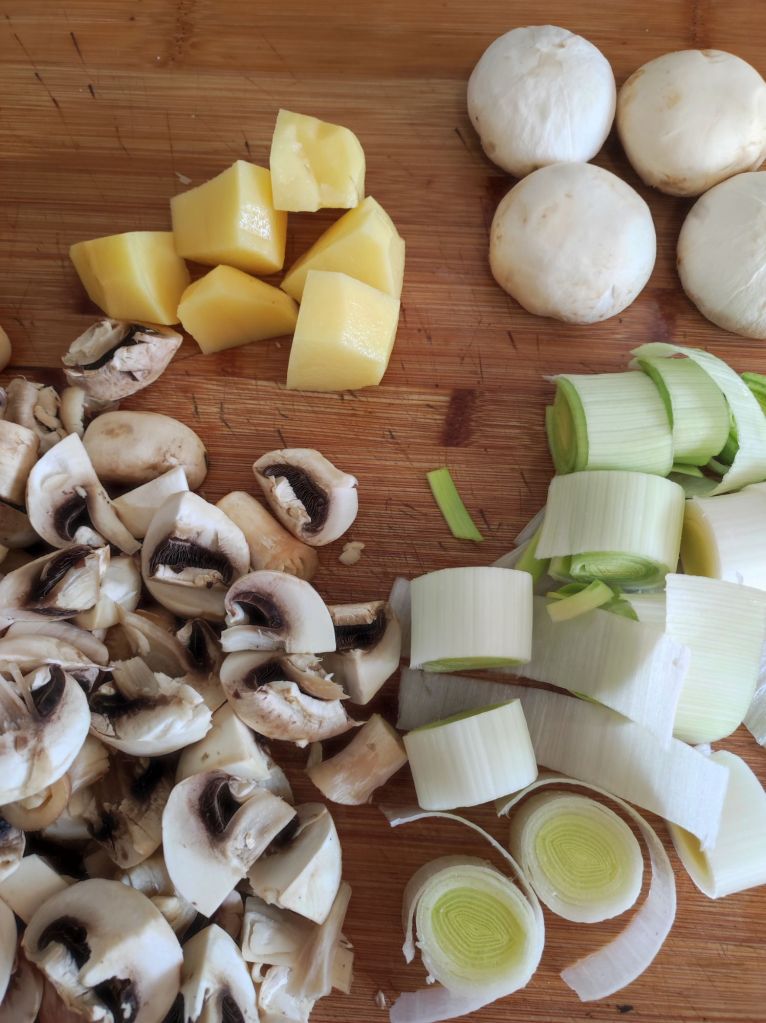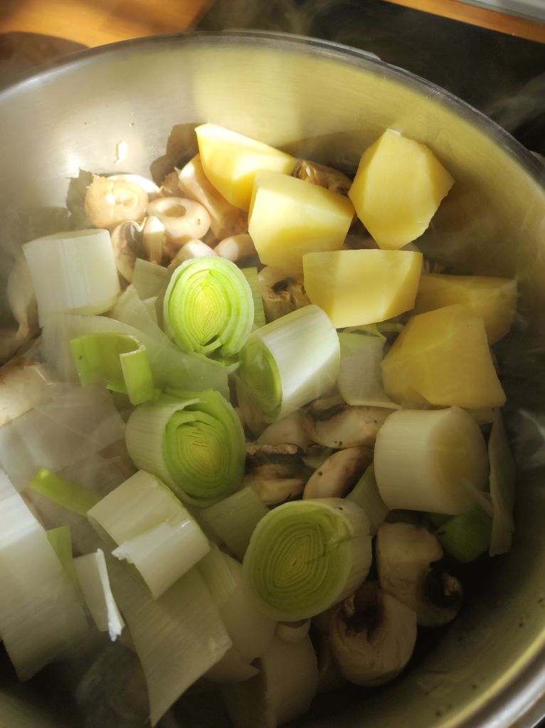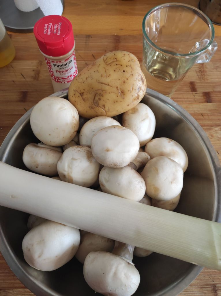 - Pon el aceite en una olla a fuego medio alto y añade los champiñones, el puerro , la patata y una pizca de sal.