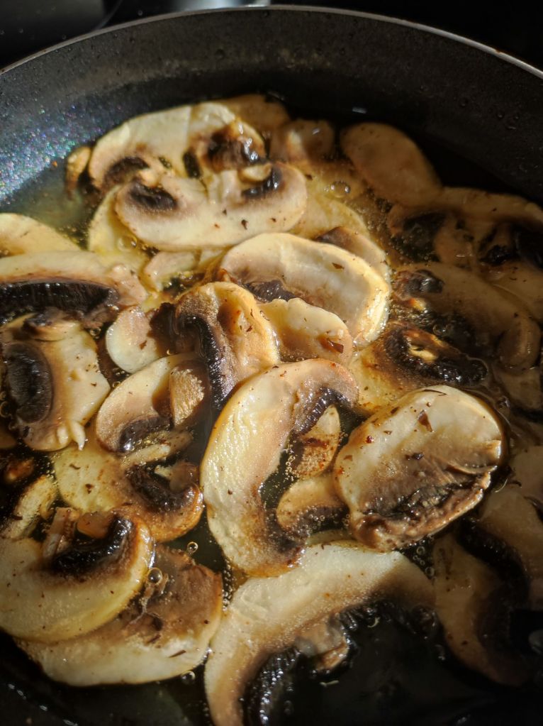 - Sirve en plato ondo o cuenco con láminas de champiñones fritos encima.