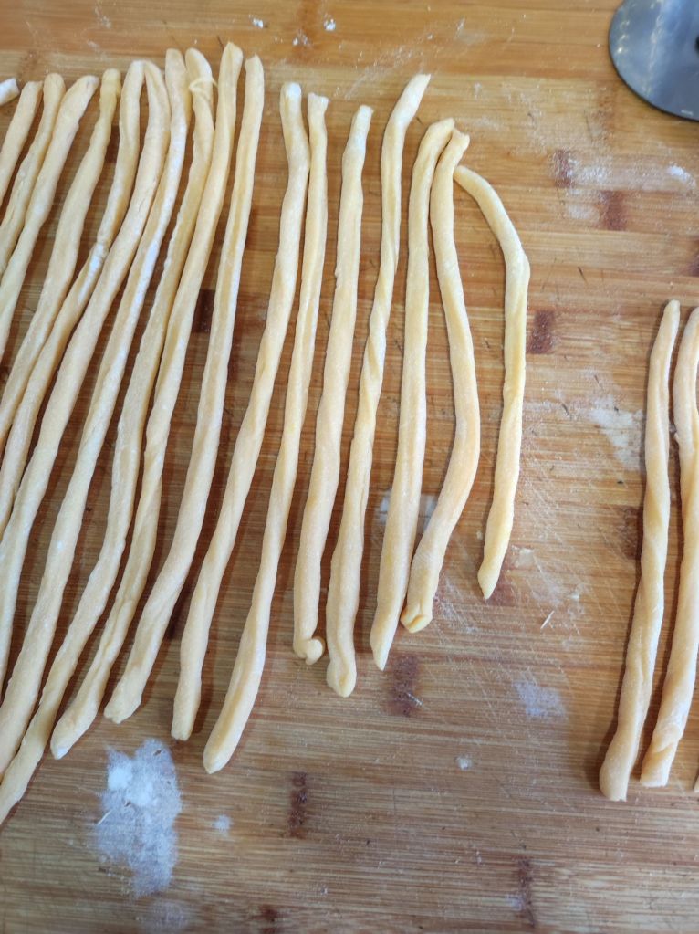 - Corta la masa en tiras de no más de un centímetro de anchas.