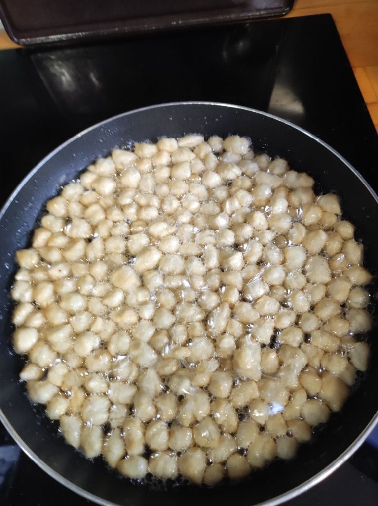 - Comprueba el punto de la miel a menudo, dejando caer unas gotas en el agua y tal como te he comentado cuando veas que ya no se disuelve añade las bolas de masa frita a la miel y mezcla.