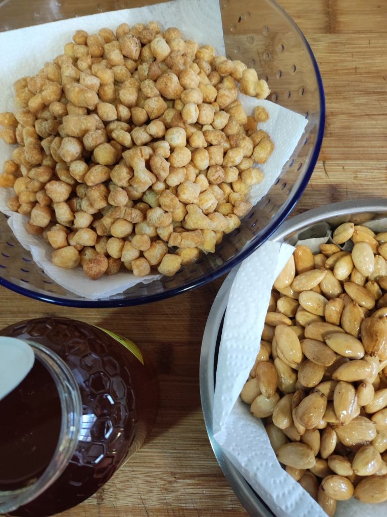 - En una cazuela grande pon la miel a calentar a fuego medio y remueve constantemente y corta o parte las almendras, no hace falta que partas todas, quede algunas enteras