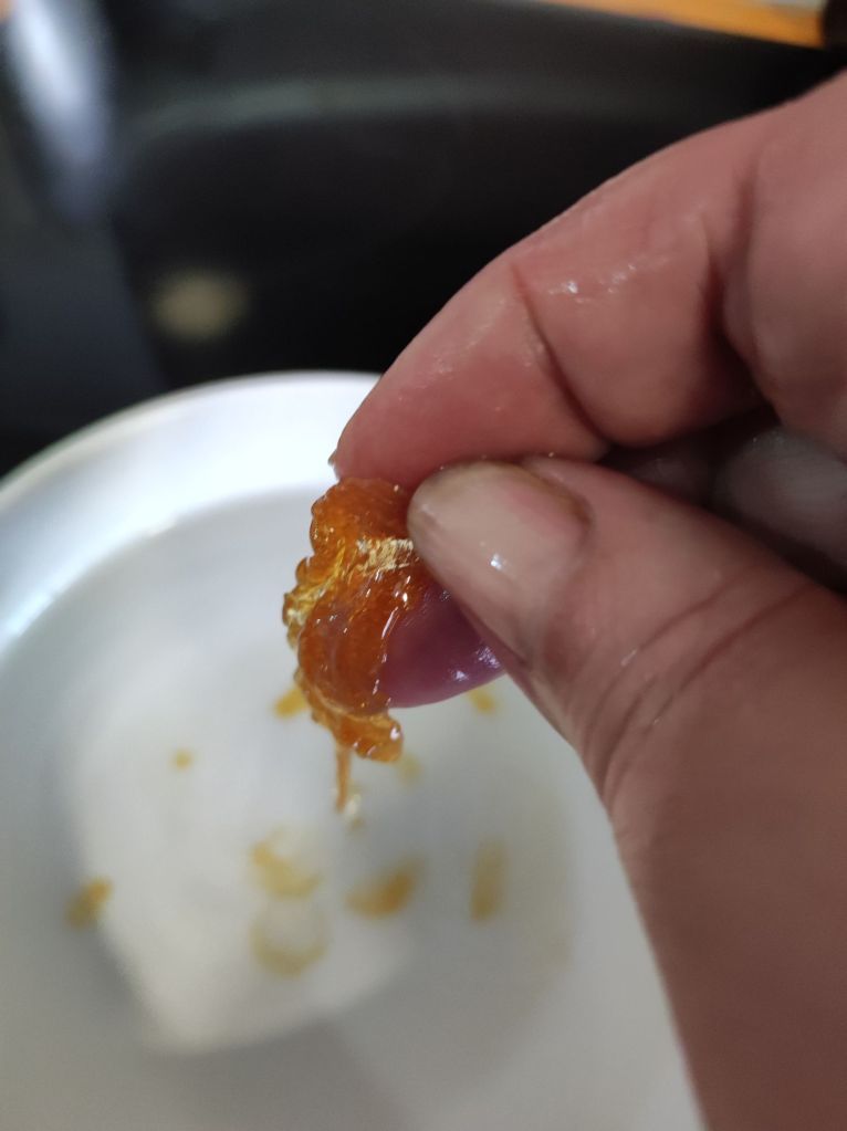 - Ponte al lado un plato o un cuenco blanco con agua, pues en ella veremos mejor el punto que tiene que tener la miel, esto consiste en dejar caer una gota de la miel que estás reduciendo sobre el agua, cuando no se disuelva en el agua ,que quede como densa , pegajosa como una » bola», significa que ya está preparada para añadir los demás ingredientes.