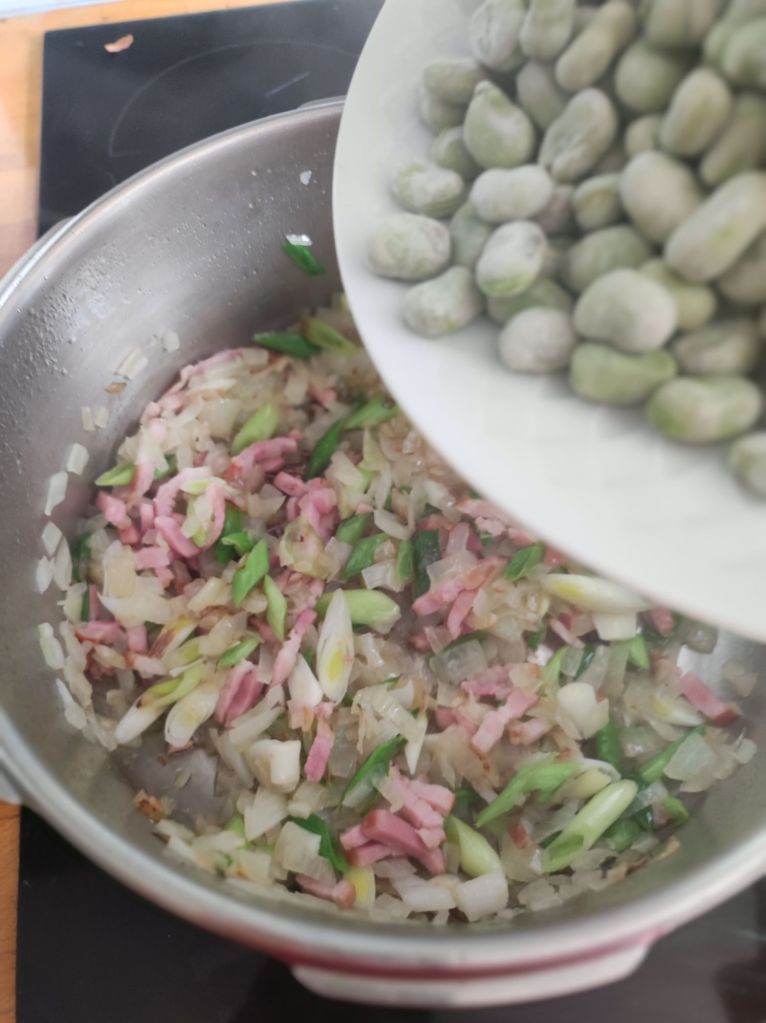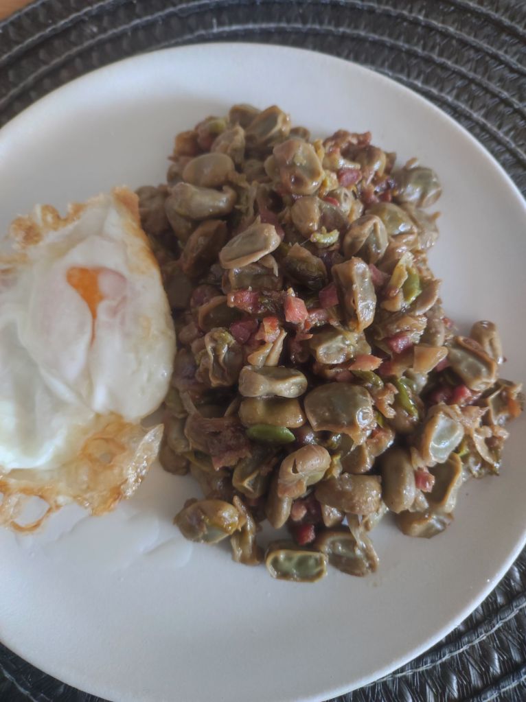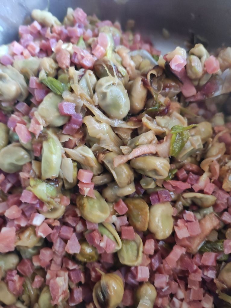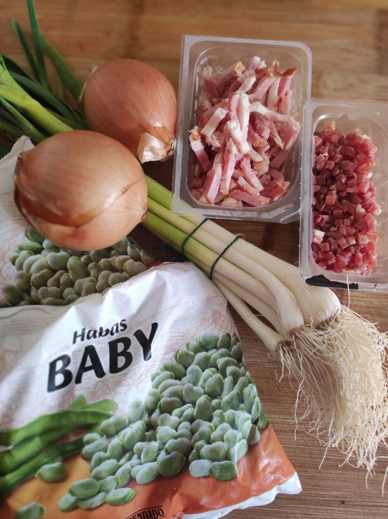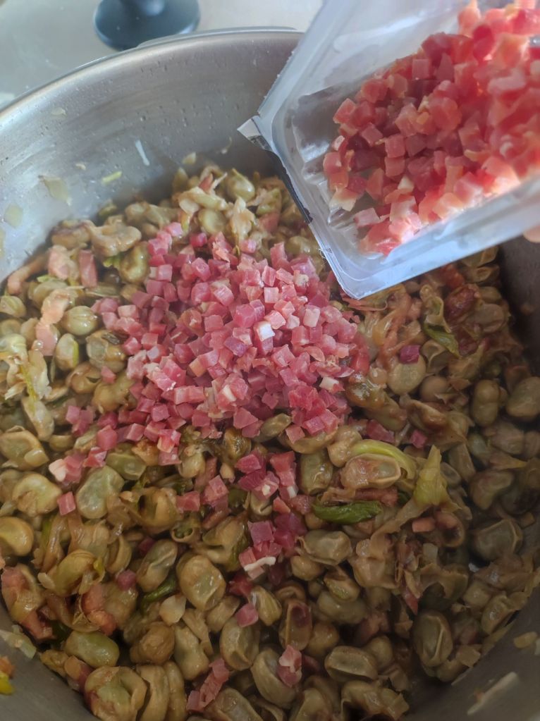 Habas con jamón, beicon y ajos tiernos.