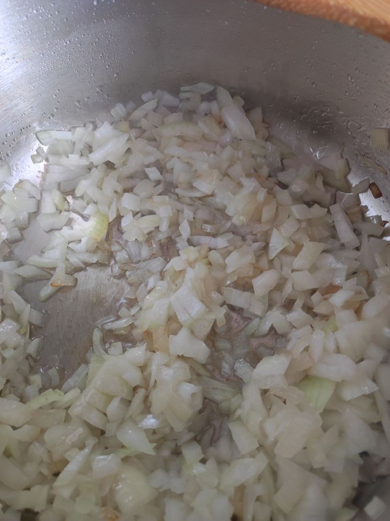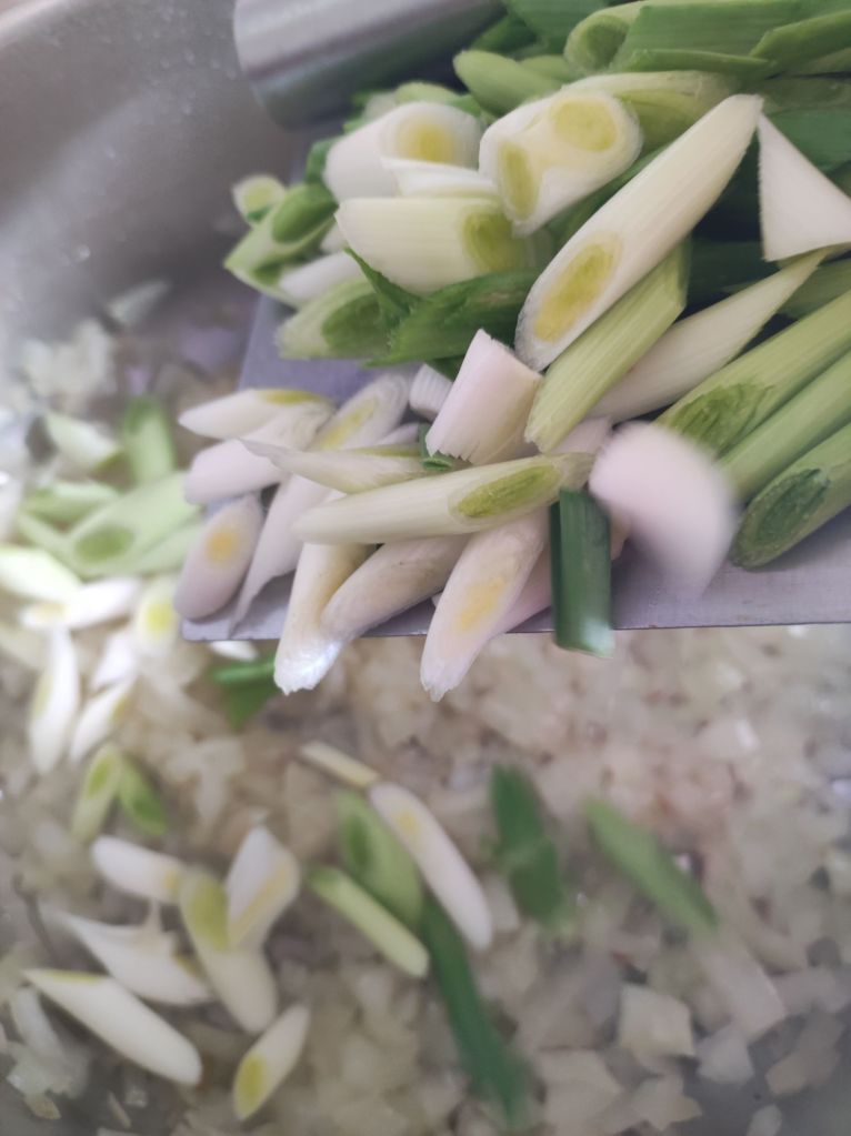 - Cuando esté medio pochada, sin tener todavía color añade los años tiernos, déjalo pochar junto a la cebolla 5 minutos más.