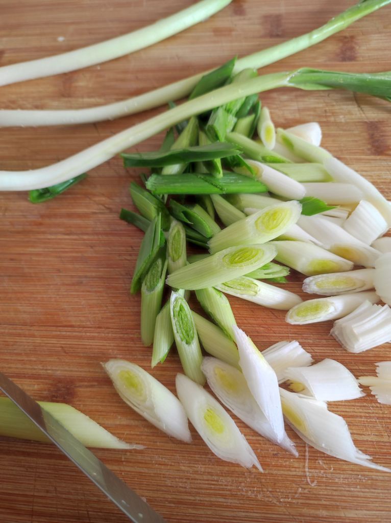 - Los ajos tiernos que tengan la cabeza más grandes córtalos por la mitad y corta en rodajas de 1 cm en forma oblicua aproximadamente.