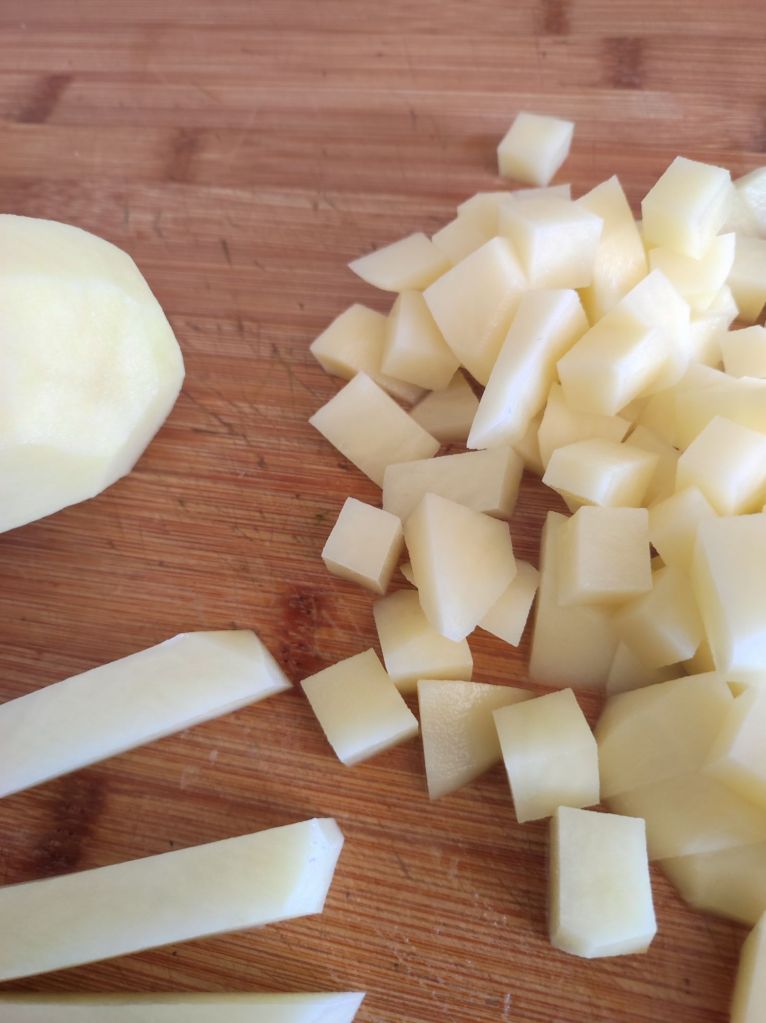 - Pela y corta las patatas a cuadritos pequeños, reserva en agua fría.