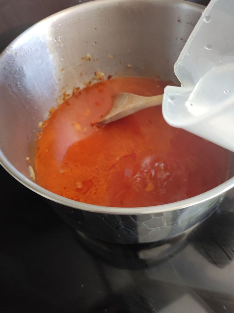 - Añade al tomate el pimentón, dale una vuelta y rápidamente vierte dos litros de agua.