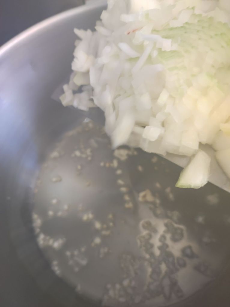 - En un puchero y a fuego medio bajo, añade el aceite y enseguida los ajos picados, cuando los ajos empiecen a dorar añade la cebolla picada con un pellizco de sal dejando que se poche.