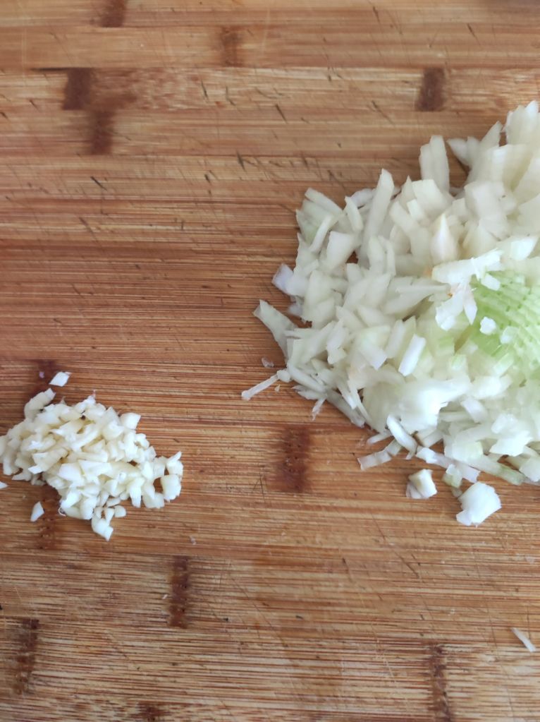 - Pela y corta la cebolla en cuadritos pequeños, pela y pica los ajos, ralla los tomates.