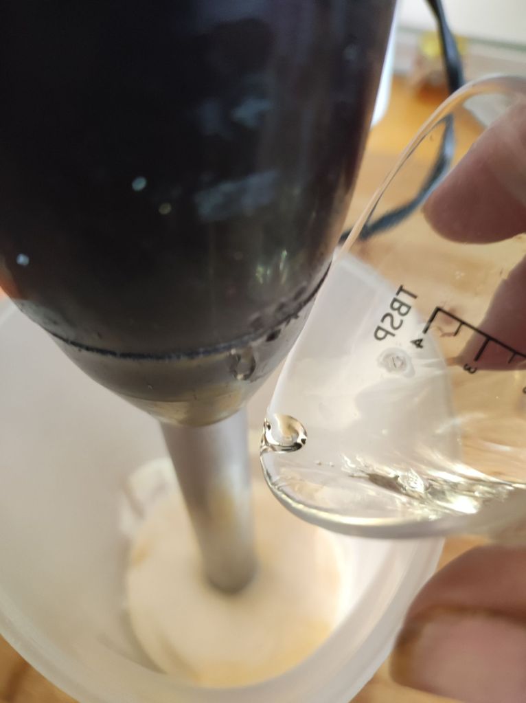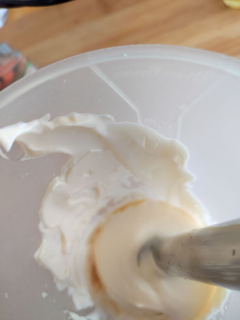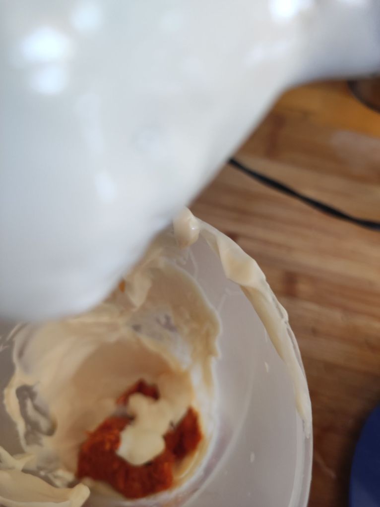 - Sin mover el brazo batidor o túrmix aprieta el botón de marcha al maximo y no la muevas, verás como poco a poco se emulsiona y se crea mayonesa.