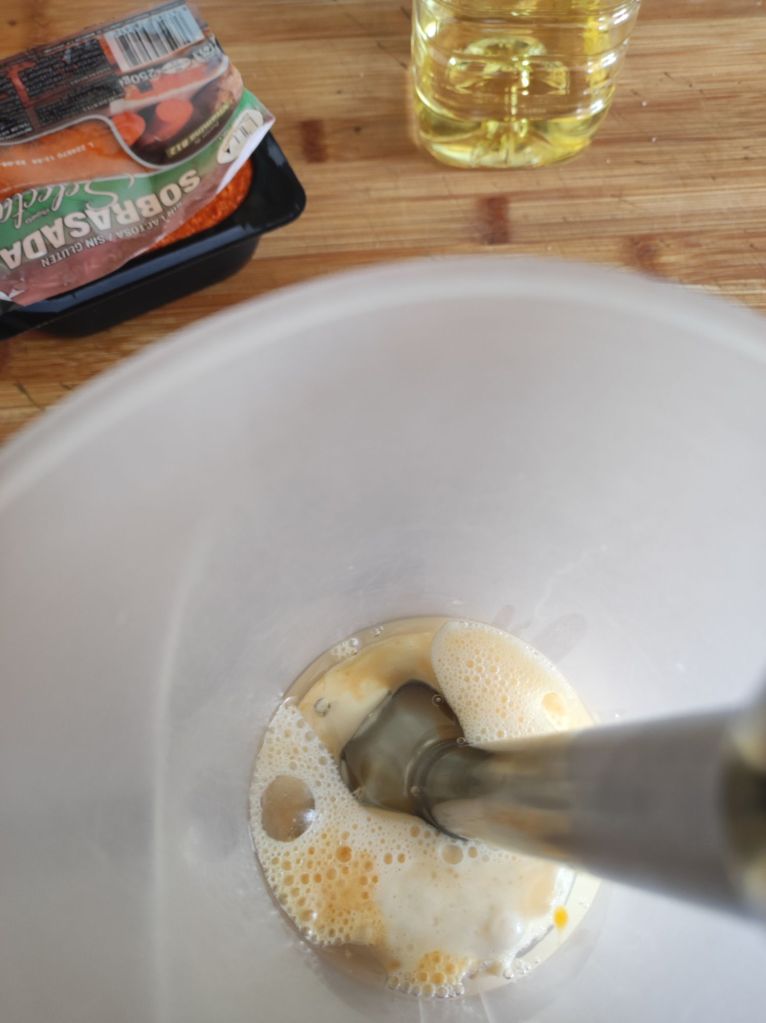 - Llegará un momento que no por mucho batirse sigue formando la salsa, el poco aceite que queda está por encima, es el momento de mover la batidora de arriba a bajo o inclinando, con movimientos lentos y controlados.