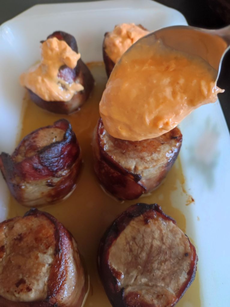 - Pasado el tiempo, saca los medallones del horno y napa o cubre por encima con una buena cucharada de mayonesa de sobrasada cada uno de los medallones.