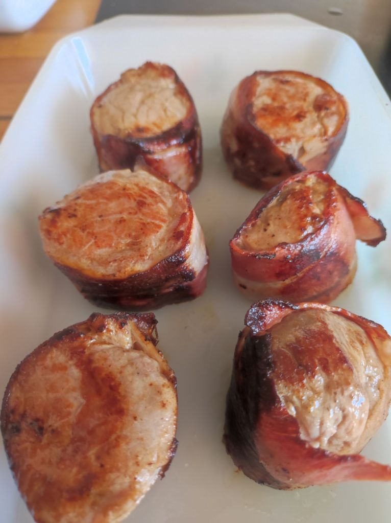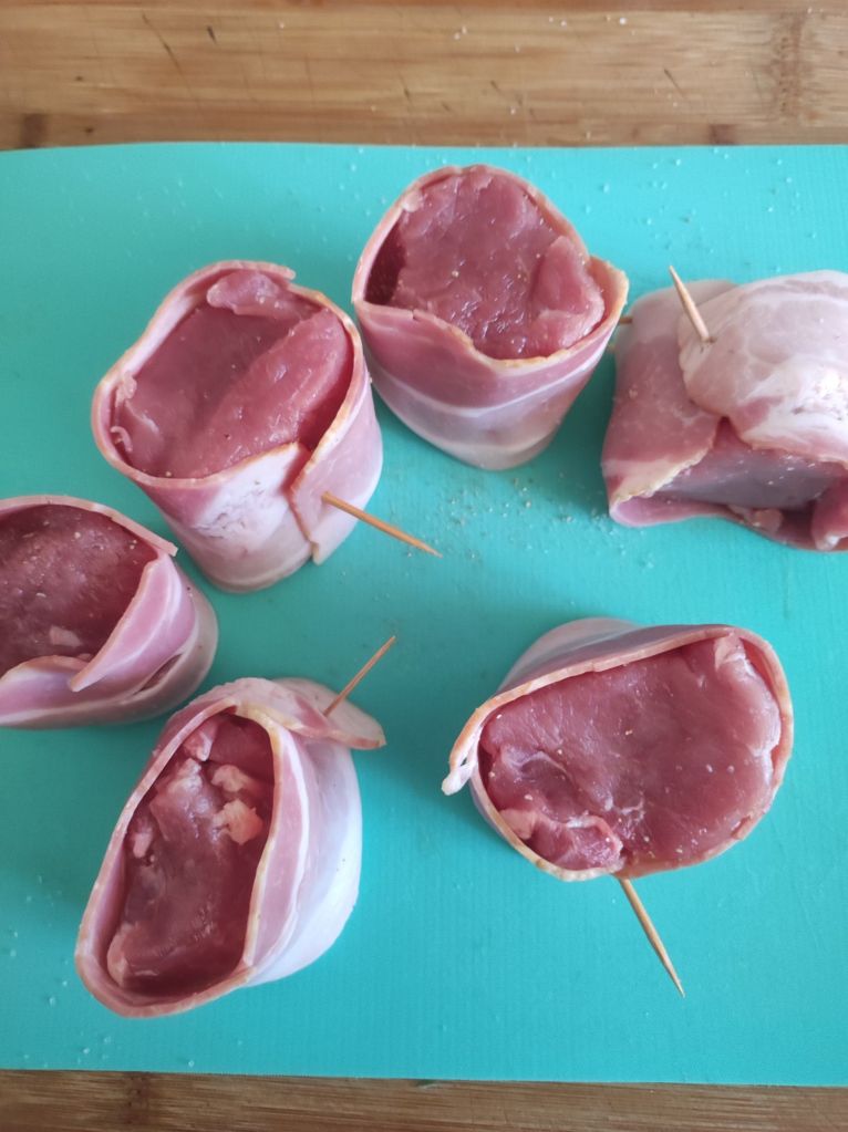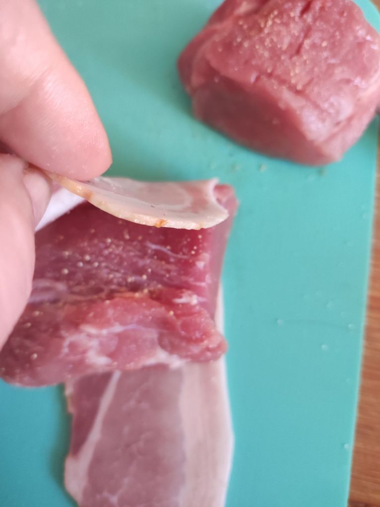 - Salpimenta los trozos o medallones solomillo y envuelve cada medallón con una cortada de beicon, sujetándola con un palillo.