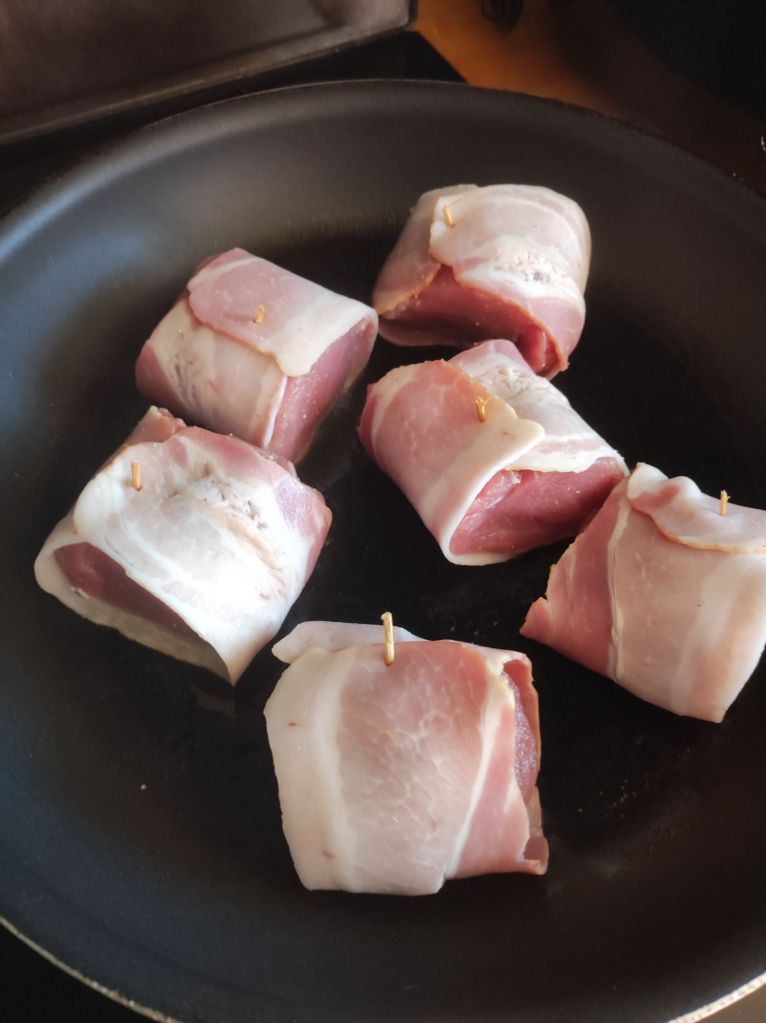 - Los solomillos de cerdo no suelen ser muy grandes, pero si no tienes bastante con una loncha de beicon para rodearla añade un trozo más y sujétala con 2 palillos.