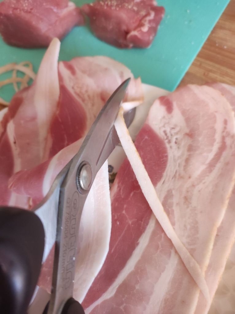 - Recorta con las tijeras la corteza del beicon y pon el horno a precalentar a 180º, calor arriba y a bajo.