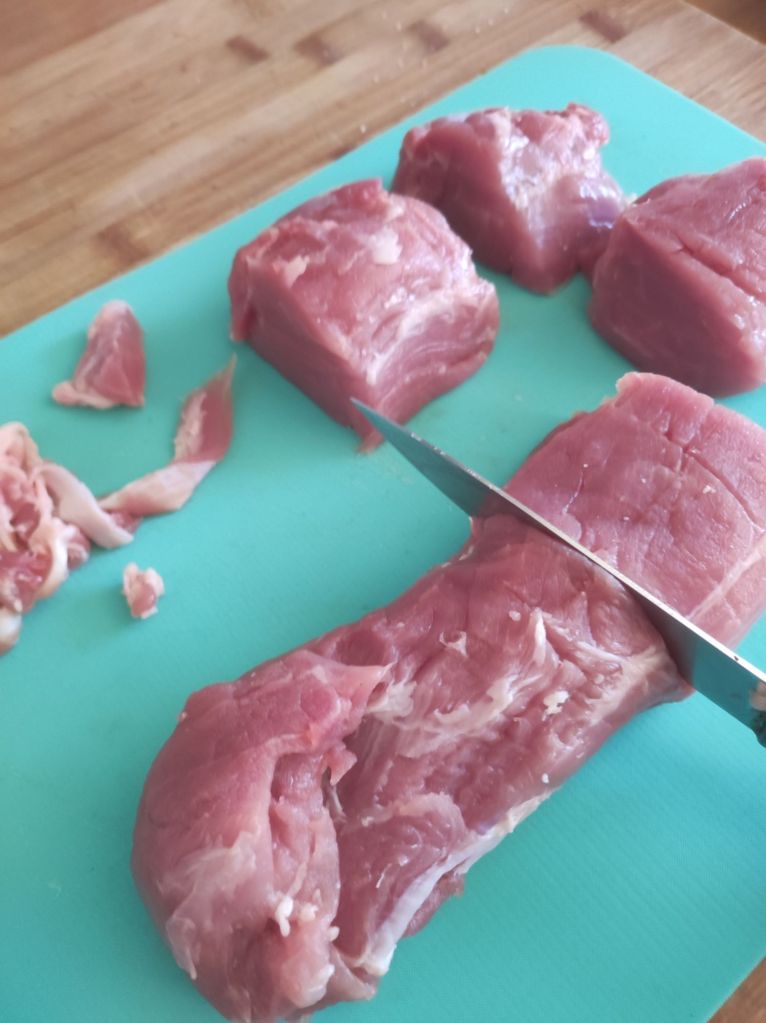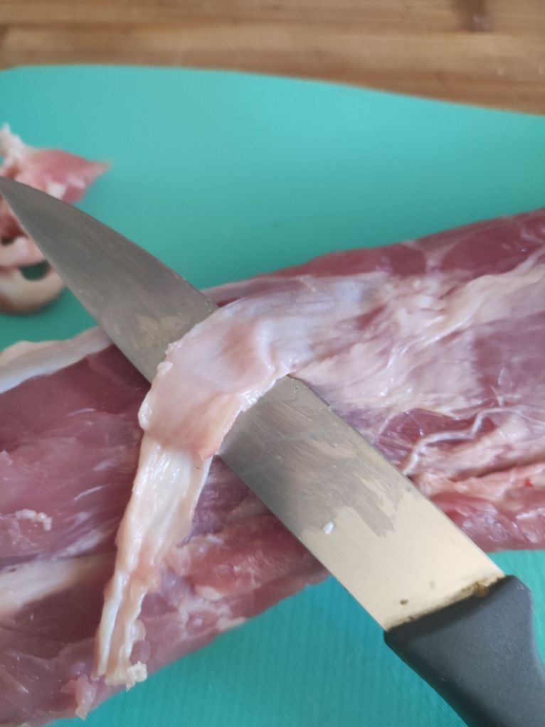 Limpia el solomillo de la telilla que tiene en un lado, es fácil, localiza la telilla y con un cuchillo con punta busca donde está la zona más pequeña , pasa la hoja de cuchillo lo más superficial posible debajo de esa telilla y desliza el cuchillo tirando con la ayuda de la mano, tirando