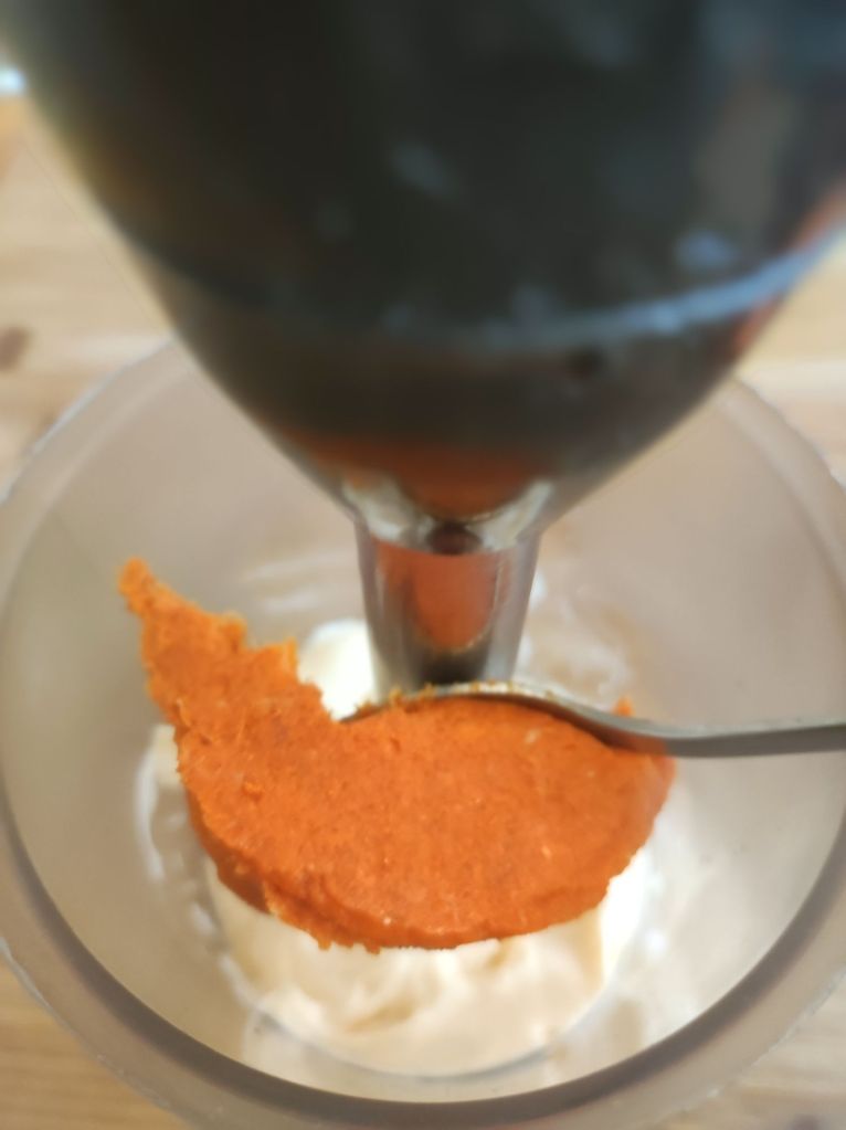 - Una vez tengas la mayonesa bien atada ya puedes añadir la sobrasada, bate que se incorpore bien y ya la tienes hecha, tapala y a la nevera, te recuerdo que esta salsa la encontrarás también en mi blog, en salsas o como mayonesa de sobrada por si la necesitas para otras recetas y con truco por si se te corta.