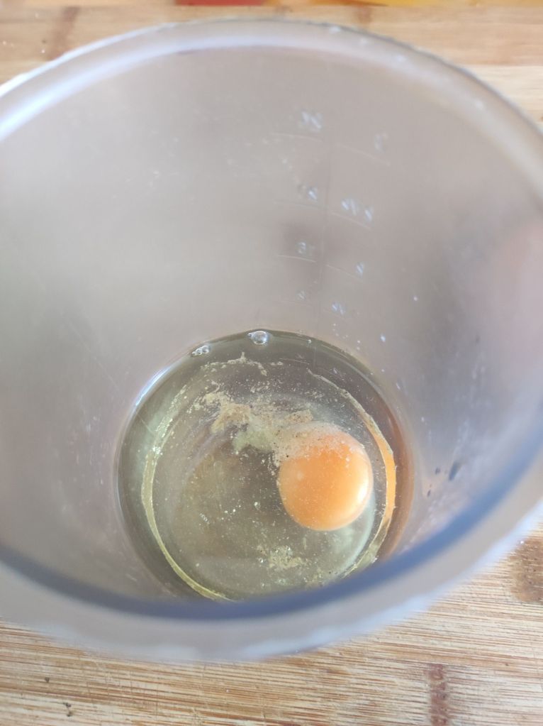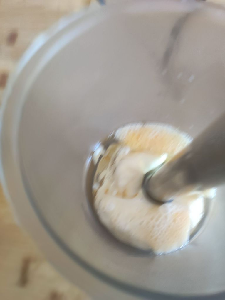 - Prepara primero la mayonesa de sobrasada, en un vaso batidor, casca el huevo, añade un pizca de sal y el aceite, sumerge el brazo de la batidora inclinado, para que no quede aire, ahora ya la puedes batir sin moverla a velocidad alta, cuando veas que la emulsión cubra completamente la cabeza de la túrmix, luego inclinala, sigue batiendo e inclinala del otro lado, así va emulsionando con un poco más de aceite, ahora con movimientos lentos sube y baja la túrmix que estará a la misma velocidad alta.